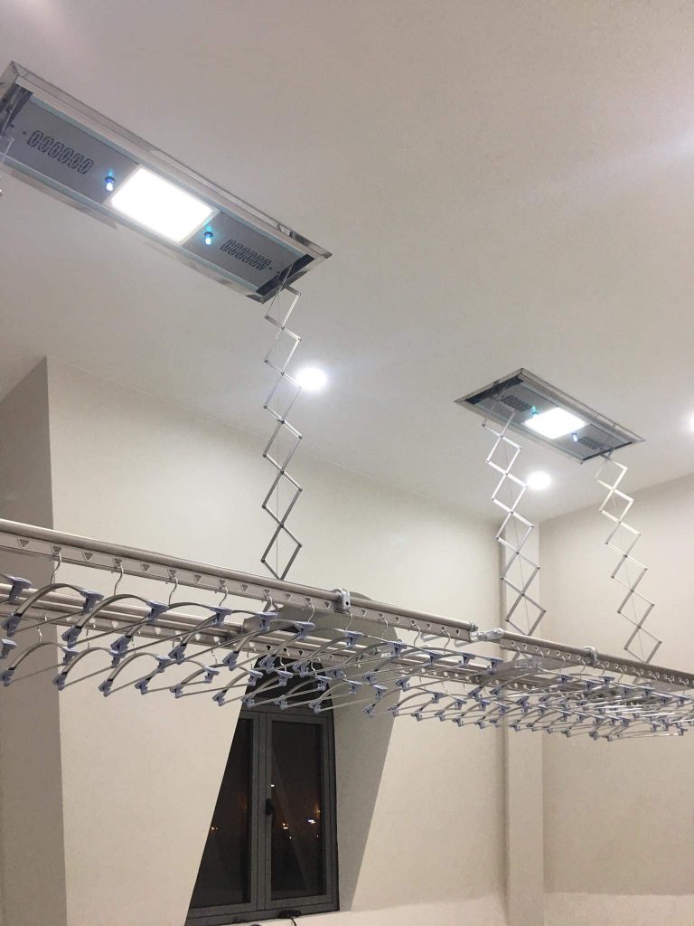 Điểm thuận tiện của giàn phơi nữa đó chính là có đèn chiếu sáng. Vừa thuận tiện cho việc phơi đồ, vừa giúp không gian có thêm một chiếc đèn trang trí.